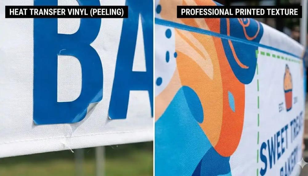 This method applies cut vinyl logos to canopy fabric using heat. While affordable, it may not last long under weather exposure.